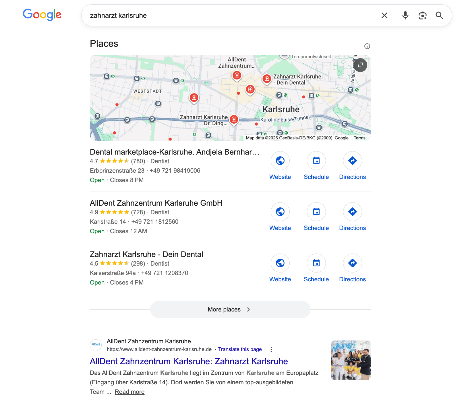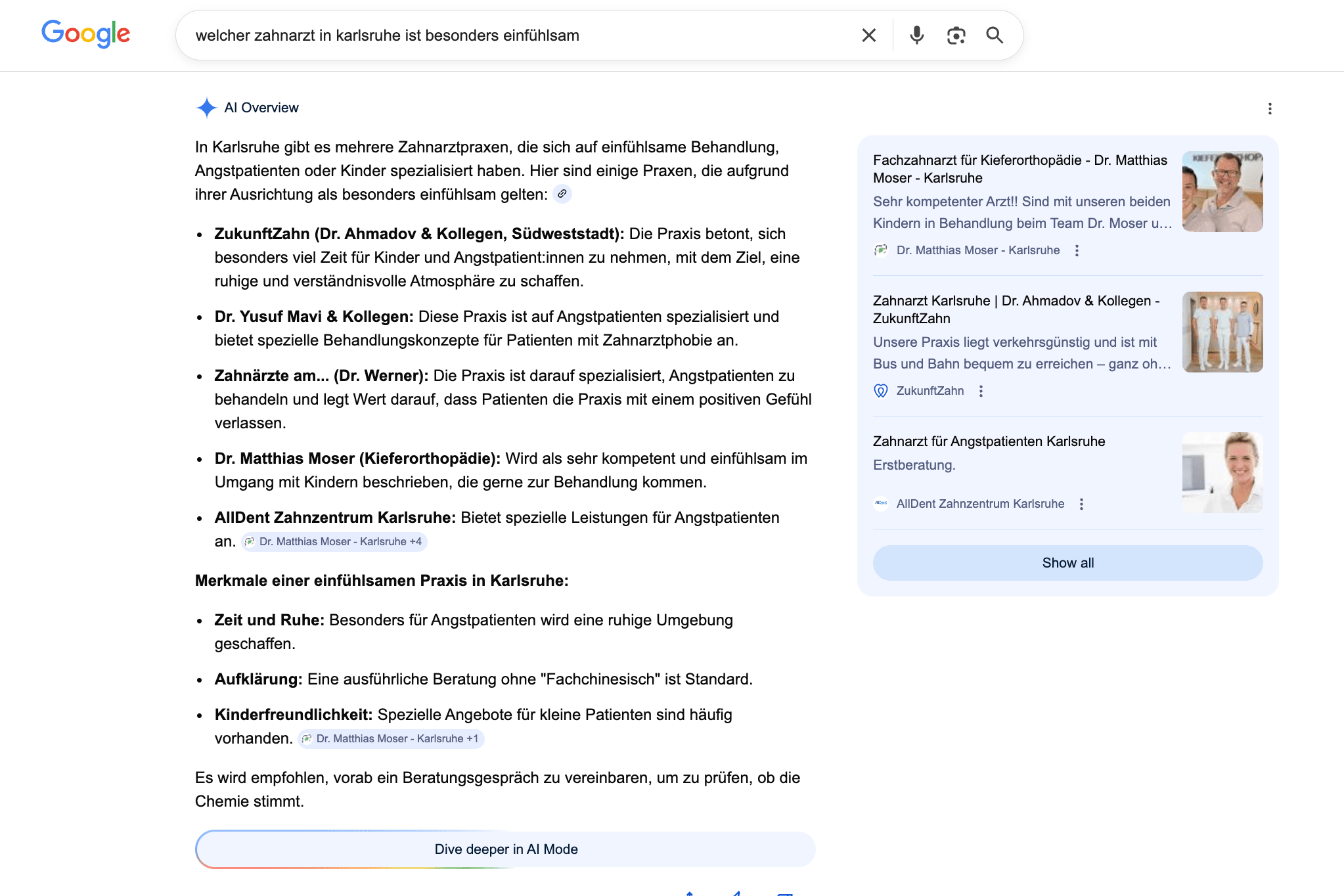 Wie relevant ist GEO für die Patientensuche? Ehrlicherweise: Noch nicht für jeden Fall. GEO wird aktuell noch nicht bei allen Suchbegriffen ausgespielt. Gerade bei sehr direkten, „transaktionalen“ Suchen wie einfach nur „Zahnarzt + Ort“ bleibt es spannend. Wer einfach nur schnell eine Praxis in der Nähe vergleichen will, sieht weiterhin oft die klassische Kartenansicht (Maps).